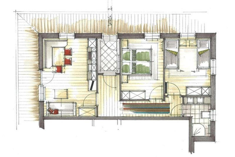 New furnished 2-rooms-apartment on the ground floor, large livingroom with couchbed for 2 persons, kitchenette with oven, dining-table, 1 bedroom with doublebed, shower and WC with entrance from the bedroom and from the livingroom, TV, radio, wardrobe, separate entrance, balcony. 46 m²