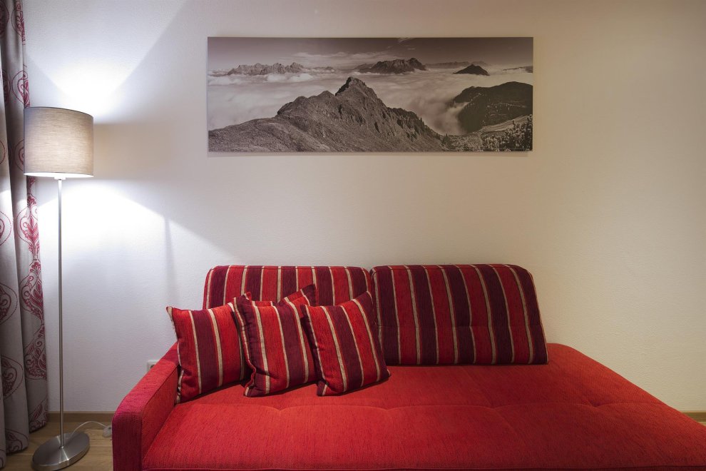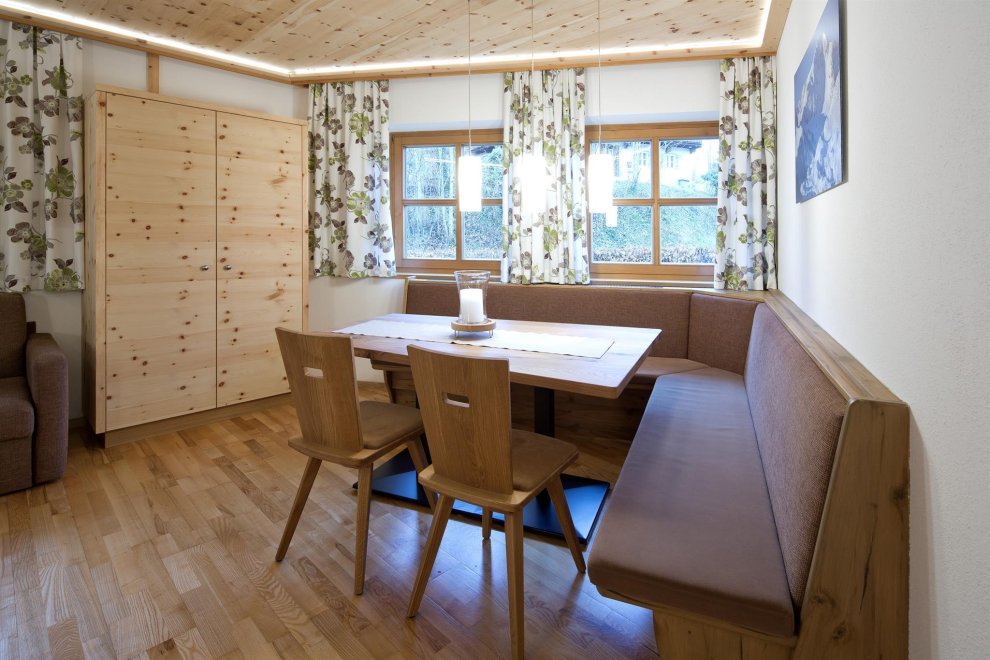 90m² appartement on the 1st floor with private entrance and covered loggia with seating. 1 Swiss pine bedroom with boxspring-doublebed, 1 Swiss pine bedroom with boxspring-doublebed and chaiselongue, 2 x SAT-TV, 2 bathrooms, 2 toilets, hairdryer, safe, WIFI. Living room with double sofa bed, seating and electric stove. Fully kitchen with cooker, Soda-Stream, ceramic hob, dishwasher, coffee machine, microwave, washing machine, kettle, tea towels, utensils and cutlery. Storage room, ski room.