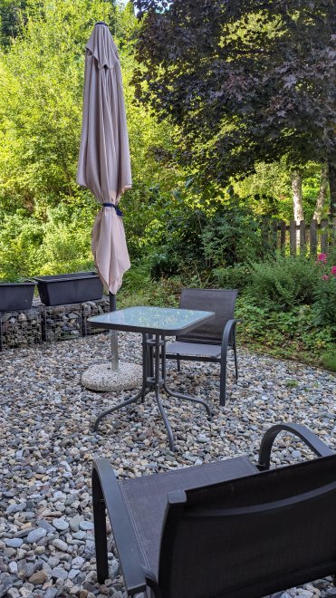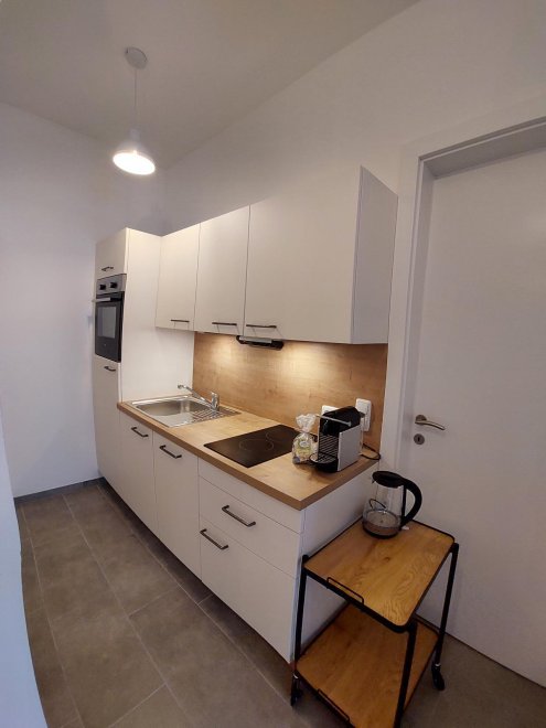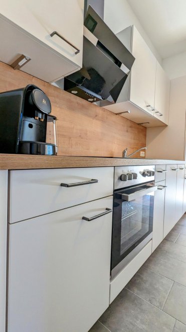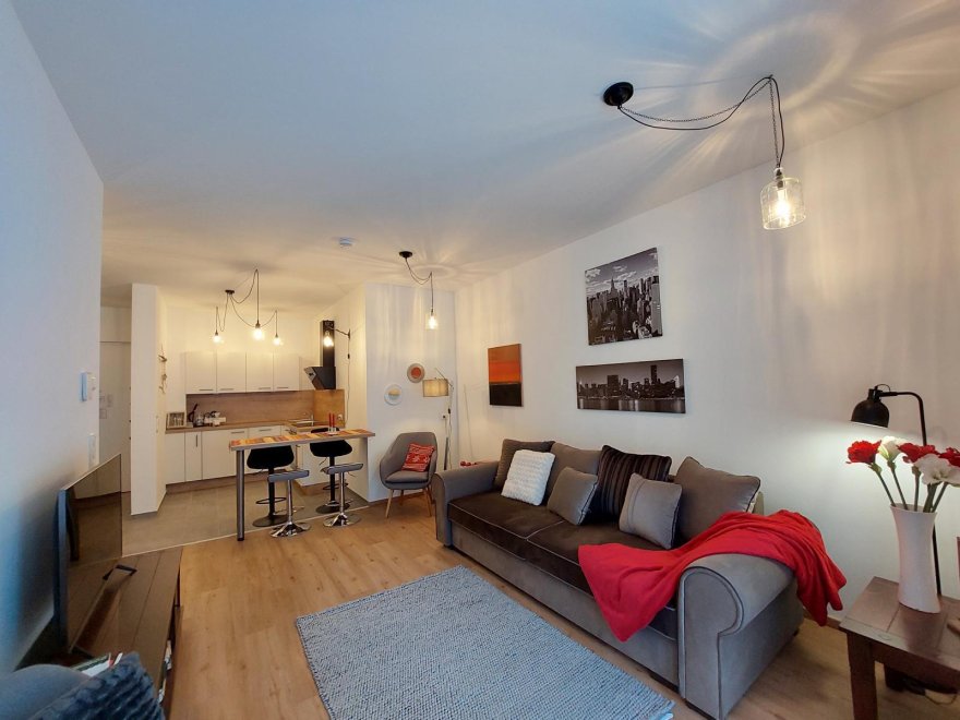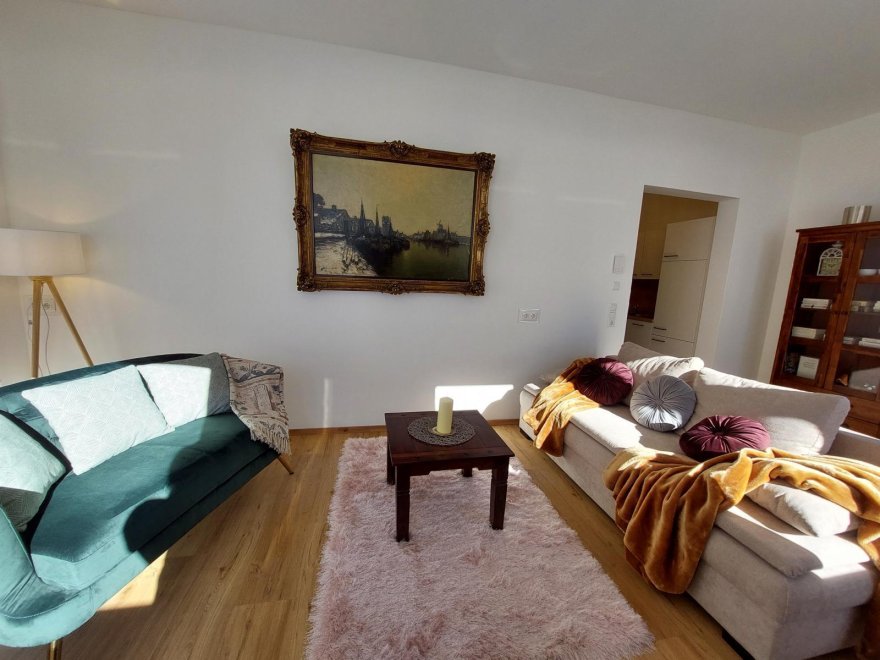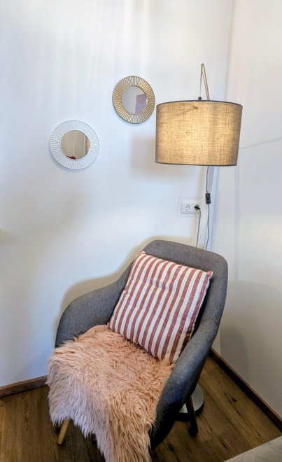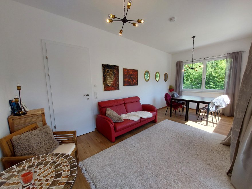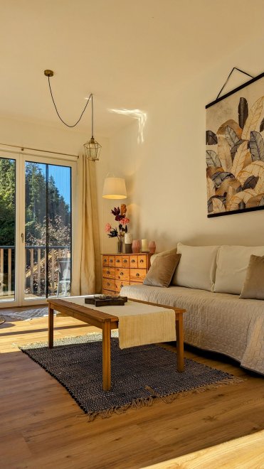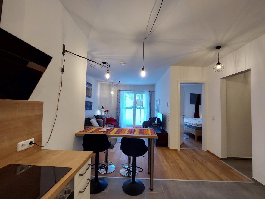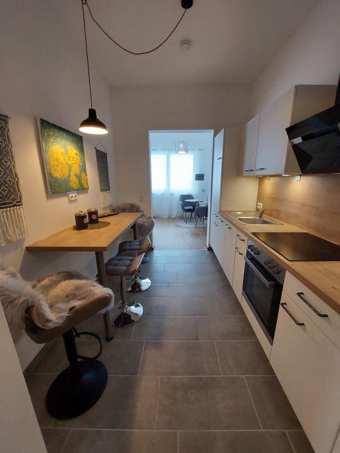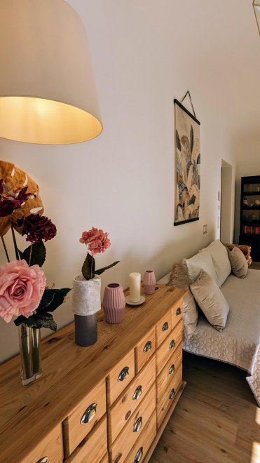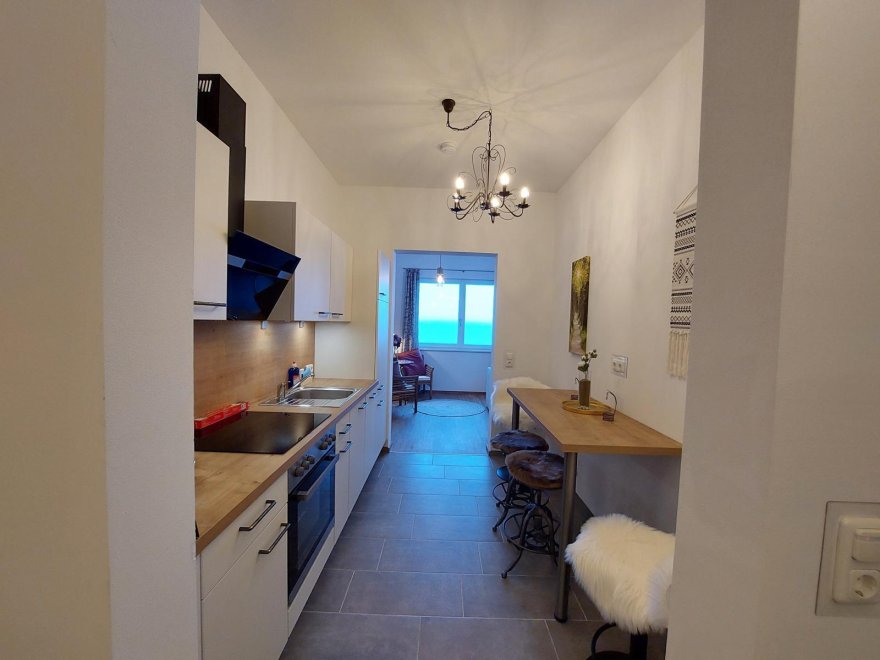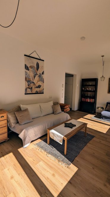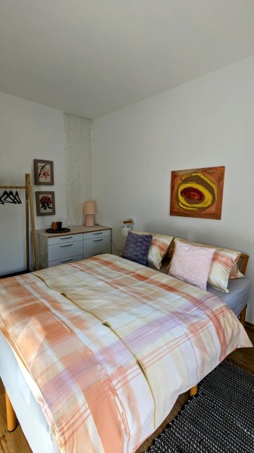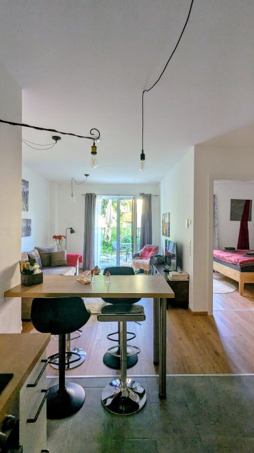 An apartment furnished with attention to detail and user friendlyness comes with a full size kitchen which seamlessly goes over to the livingroom. the bright living room offers you a couch as well as other seating which invite you to read, chat, watch TV or simply relax. You will also find a separate bedroom, a storage room and a spacious, bright bathroom. The terrace is located on the east and south sides of the apartment.