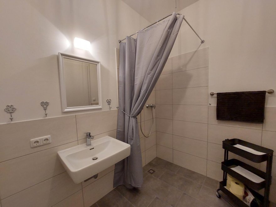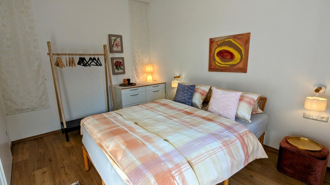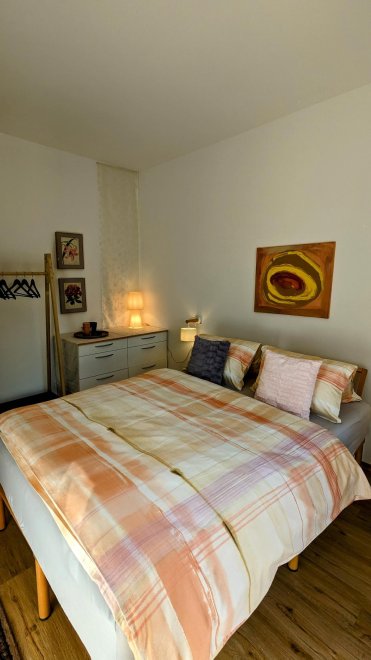 The apartment on the 2nd floor is furnished with attention to detail and has a fully equipped kitchen with dining area. The bright living room with balcony offers you a comfortable sofa and seating that invite you to read, chat, relax and enjoy or watch TV. Furthermore, you will find a separate bedroom with a French bed (140x200 cm) with balcony, a storage room and a bright and spacious bathroom. The balcony is located on the west side of the apartment.
