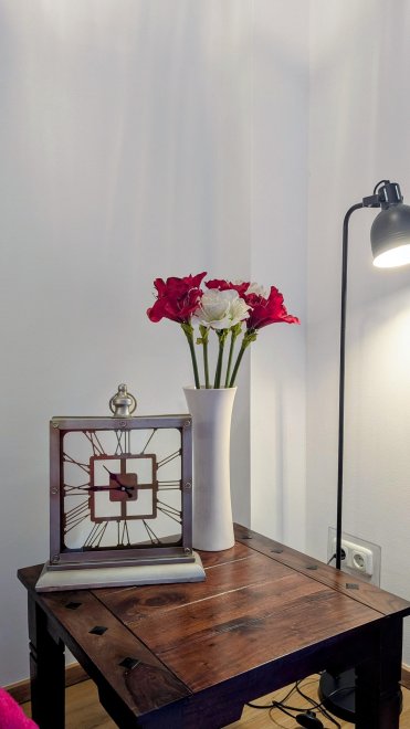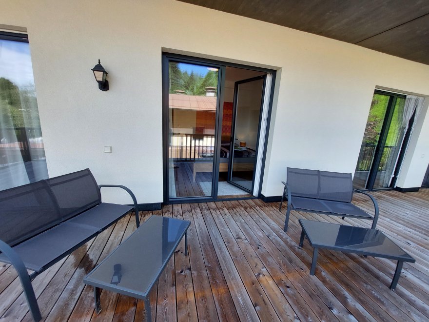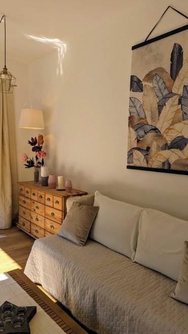 The apartment, furnished with attention to detail, has a small but fully equipped kitchen. The bright living room with terrace offers you a comfortable sofa, which invites you to read, chat, relax and enjoy or watch TV, as well as a cozy dining area. You will also find two separate bedrooms, one of which has a terrace, and a spacious bathroom. The terrace is on the west side of the apartment.