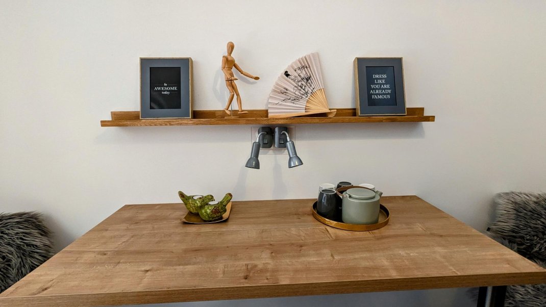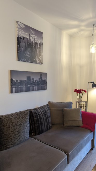 An apartment furnished with attention to detail and user friendlyness comes with a full size kitchen which seamlessly goes over to the livingroom. In the livingroom you will find a couch as well as other seating which invite you to read, chat, watch TV or simply relax. You will also find a separate spacious bathroom and a bedroom which leads to the west side balcony.