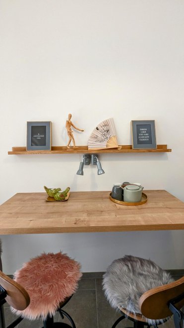 An apartment furnished with attention to detail and user friendlyness (completely equipped with underfloor heating) comes with a full size kitchen which seamlessly goes over to the livingroom. In the livingroom you will find a couch as well as other seating which invite you to read, chat, watch TV or simply relax. You will also find a separate bedroom, a storage room and a spacious bathroom. The terrace is located on the west side of the apartment.