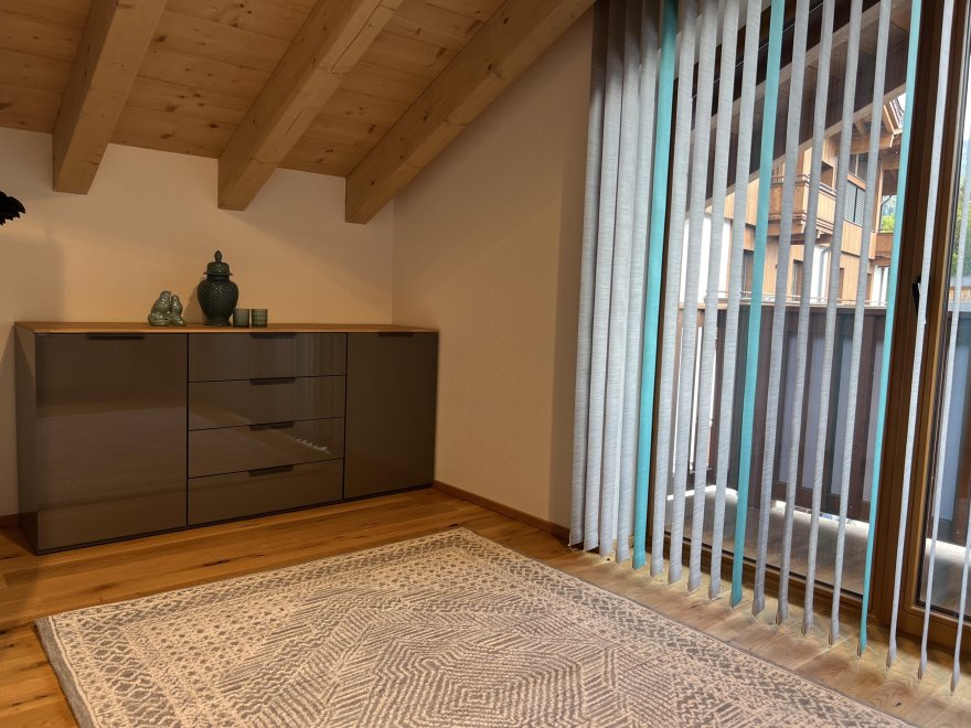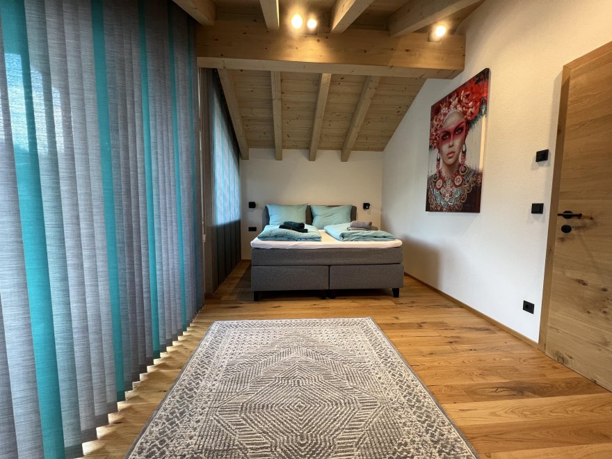 The newly built accommodation was completed in 2024, has an upscale interior and extends over two floors. Furnished with a spacious and fully equipped eat-in kitchen and open-plan living area with sofa bed and TV, the first floor forms the heart of the accommodation. The bathroom, storage room and separate WC are also located here. The terrace, equipped with a lounge set, can be accessed directly via the living area and offers a place for romantic sunsets. The two bedrooms are located on the top floor and each have their own balcony and a shared WC. There are two car parking spaces labelled "Dependance" right next to the accommodation.