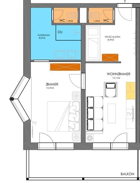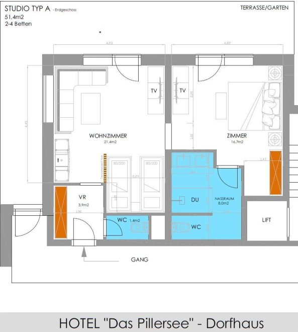 New from winter 2020/21 - Spacious rooms (approx. 51m2) with bedroom, large living room with sofa bed (can be used as a sofa bed) and two single beds, 2 Smart TV, two separate WC, large shower, all rooms with balcony - ideal for families. Studio for 2 to 4 (5) peoples.