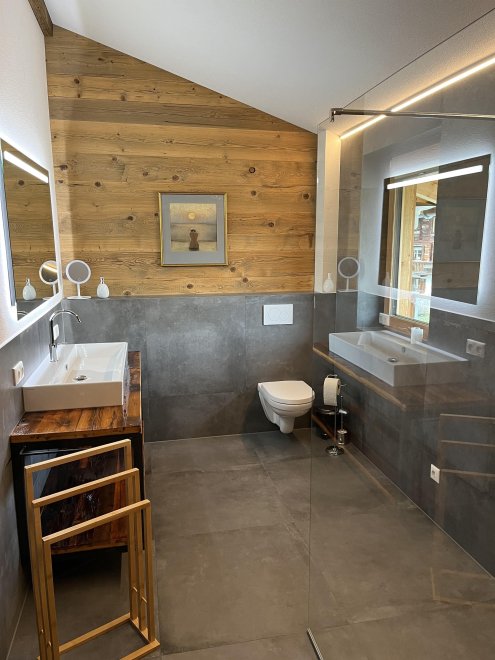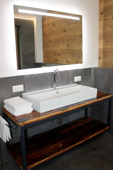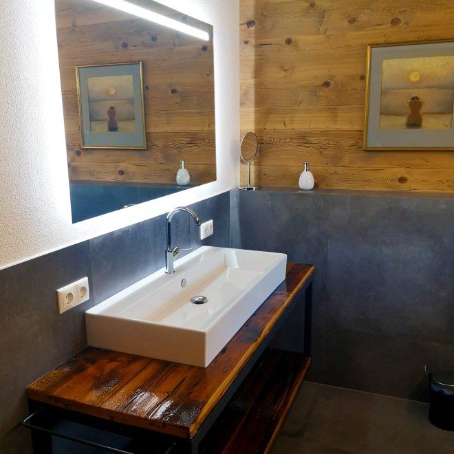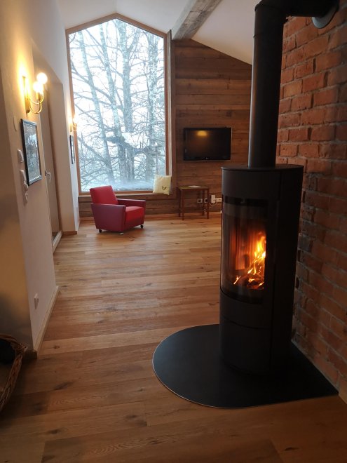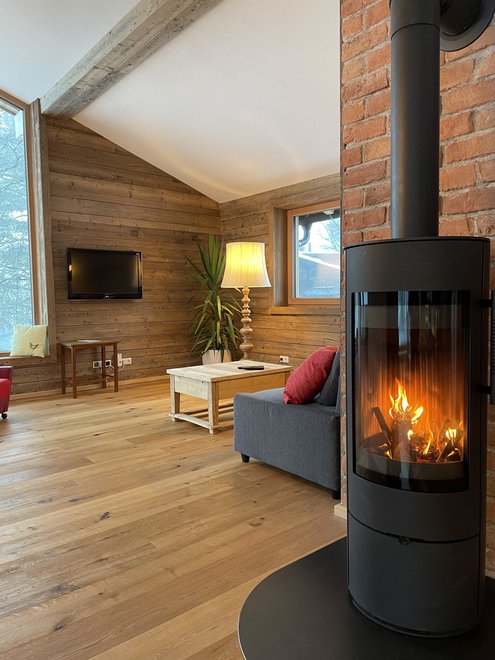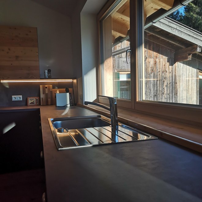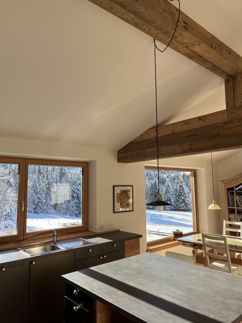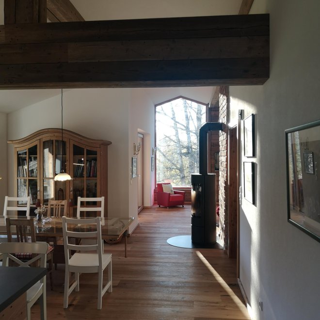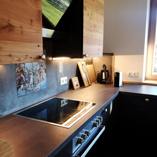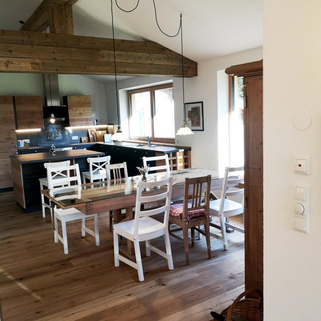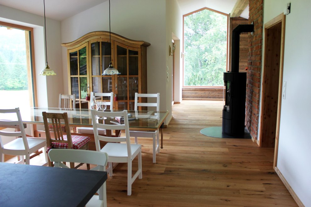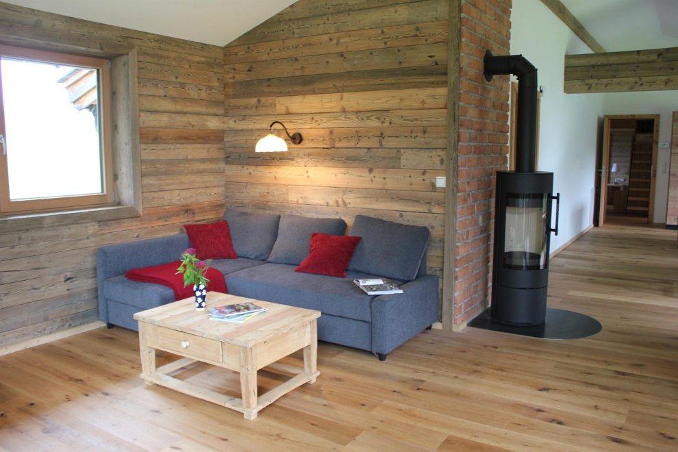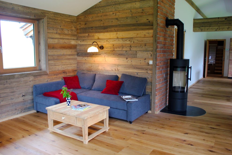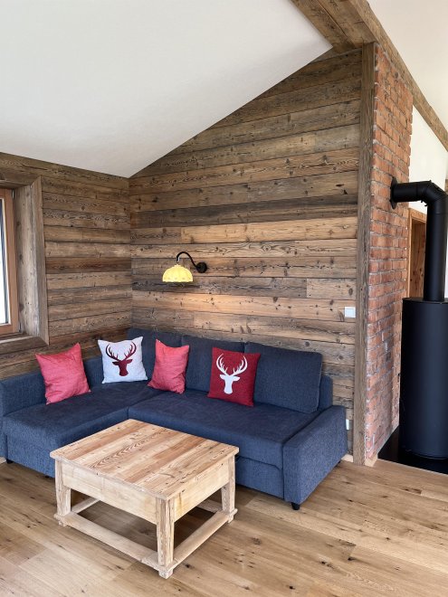 The Remise Reitl welcomes you with exclusive comfort and many lovely details. A large kitchen with a nearby dining area is connected to the living room with a large sofa and a woodstove with a glass window. Furthermore, there is a bedroom with a double bed, a children’s room with a loft bed, a large bathroom with a rain-shower as well as a second restroom.