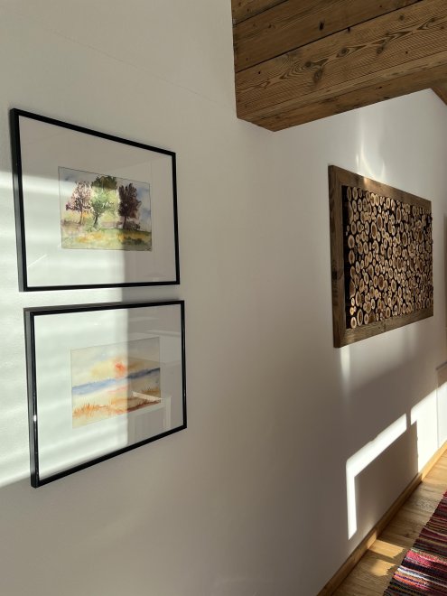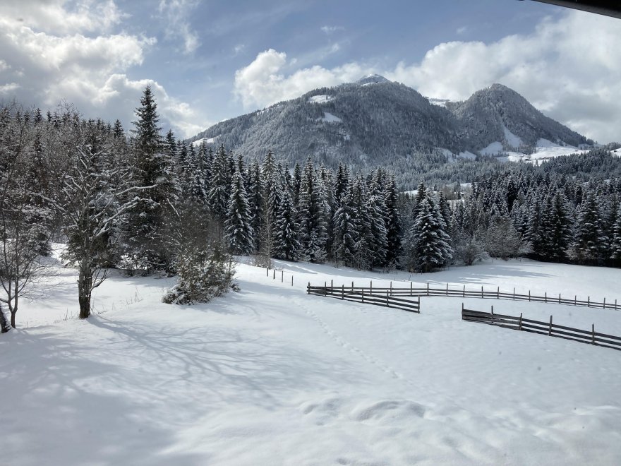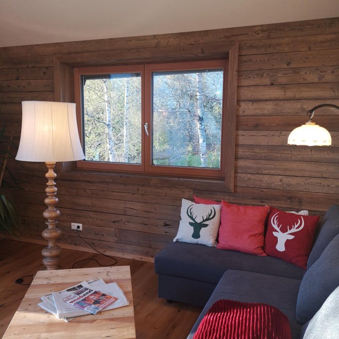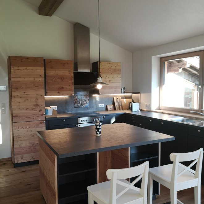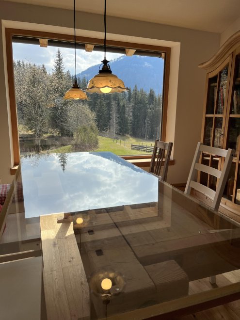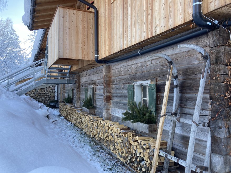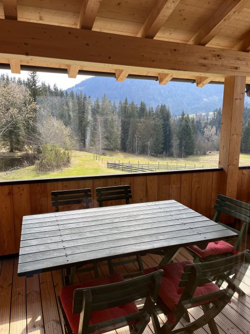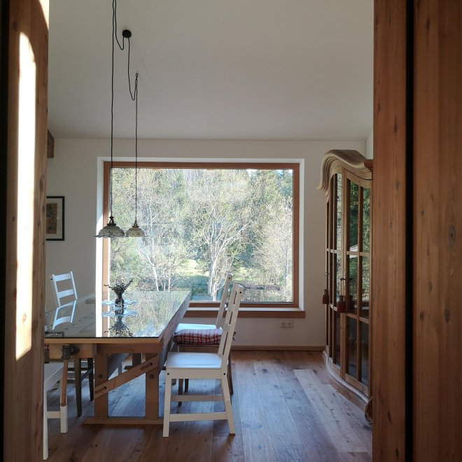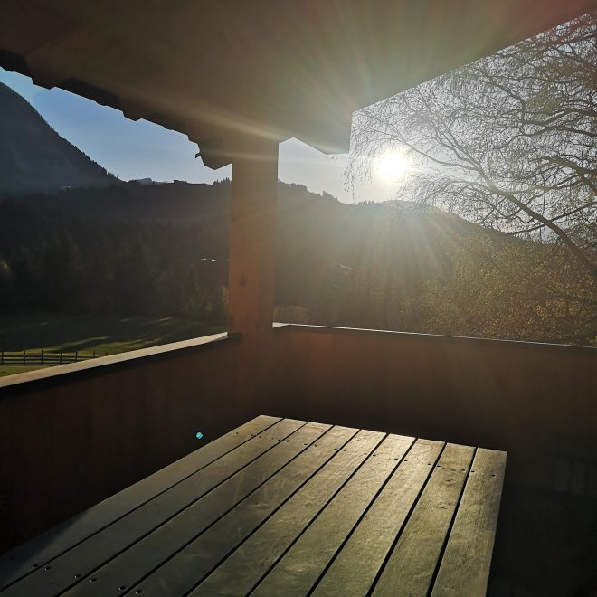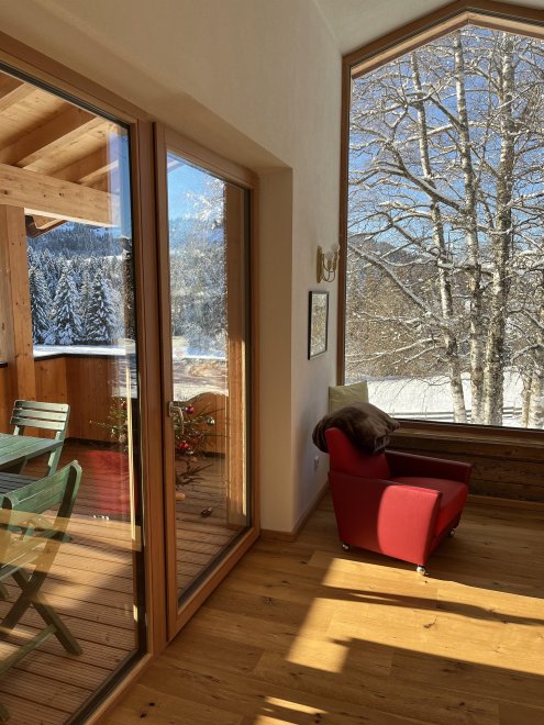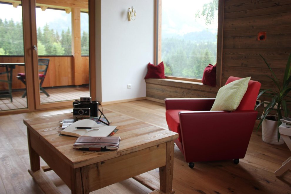 A peaceful hideaway surrounded by nature. The estate “Reitl” is situated on a plateau above the village of Fieberbrunn not far from the “Lauchsee” lake. The newly constructed almost 100 square meters of living space with large windows and a spacious loggia allow a fantastically beautiful view: forests and grasslands encompassed by the magnificent Tirolian mountains. Sheep and horses graze on our meadows, wild ducks bathe in the pond and deer come by as the sun sets.