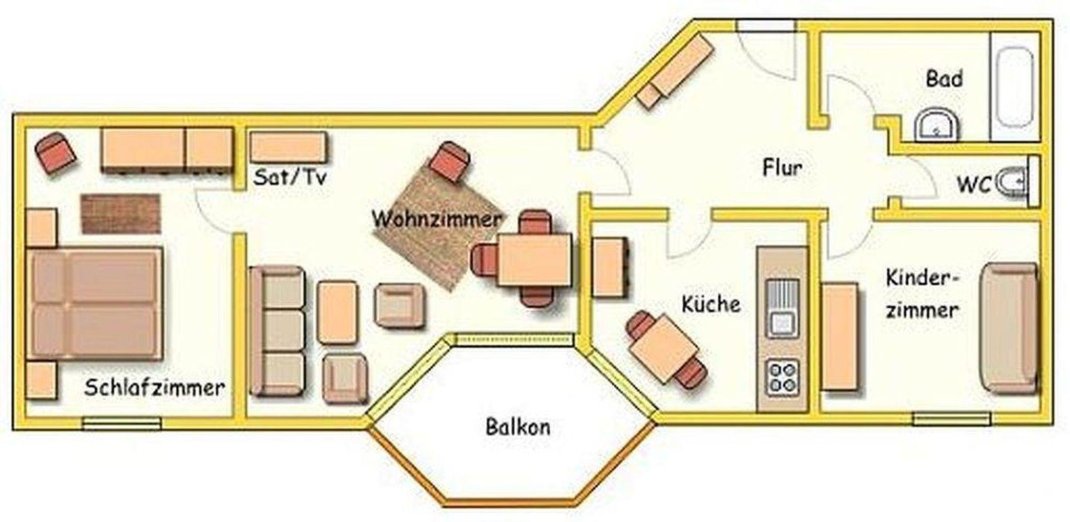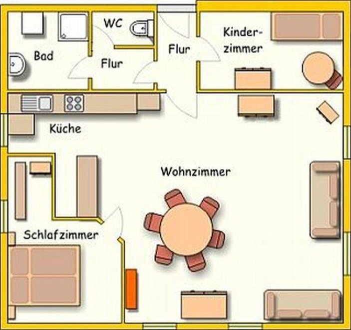 Appartement on the 2nd floor with 1 sleeping room for 2 persons, 1 sleeping room for 1 person, 1 living-/bedroom (for 4 persons), kitchenette, shower, toilet. 77 m² Non smokers only.