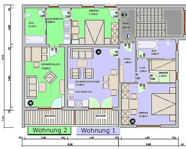 Apartment for 2-5 people: double-room, single-room, combined bed/living-room (couchbed), kitchenette, dining-table, spacious bathroom (shower/toilet), SAT-TV, balcony (south-facing), 52 m². No charge for final-cleaning!