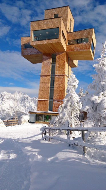 - right at the ski-bus/ hiking-bus/ bus stop