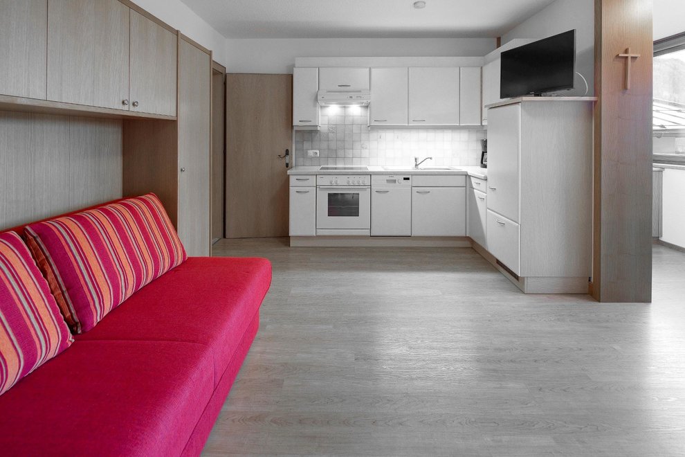 Combined kitchen and living room: including a sofa-bed, kitchen with baking oven and ceramic hob, dishwasher and a TV.