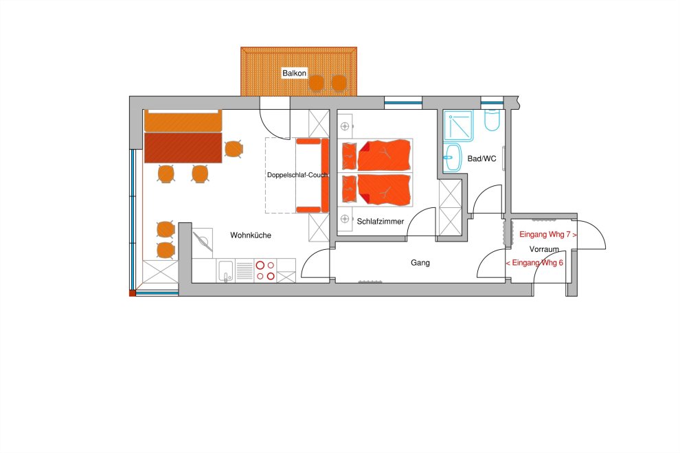 This apartment can be rented together with the apartment 5 and then provides space for 4 to 6 people.Room/apartment features