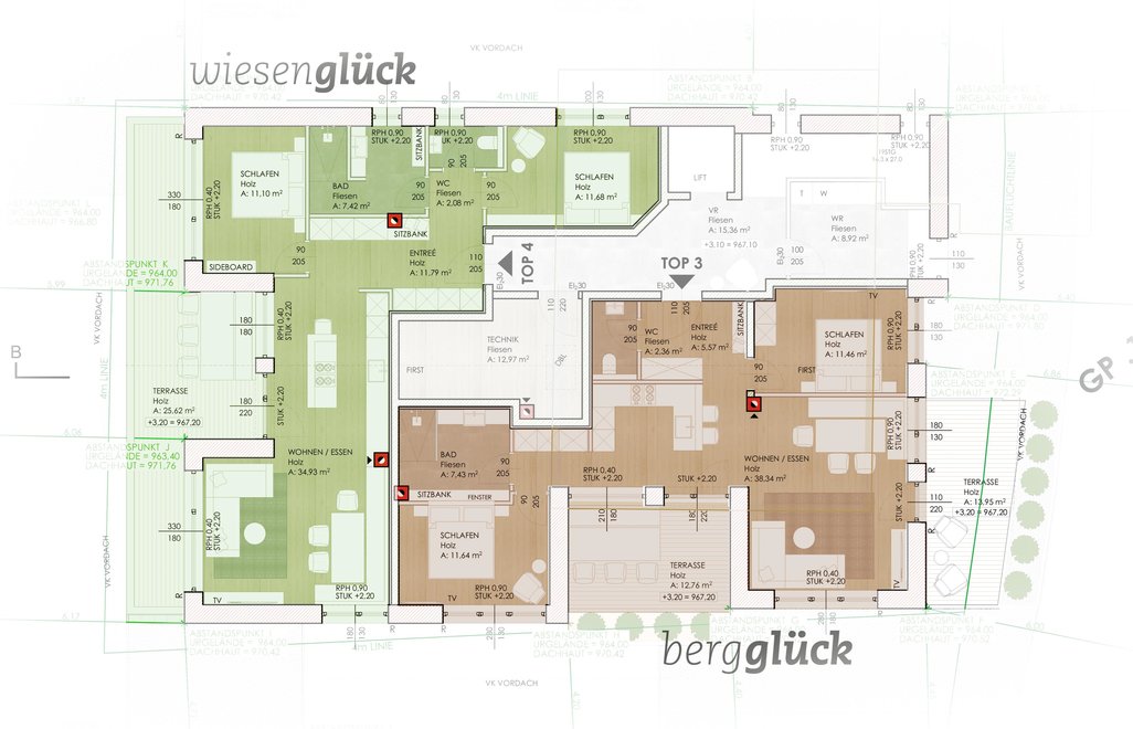 The 75m2 holiday apartment berg.glück (Top 3 at Plan) is located on the upper floor and is south-facing.