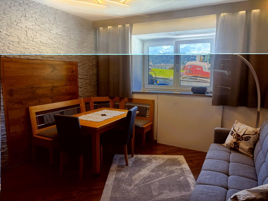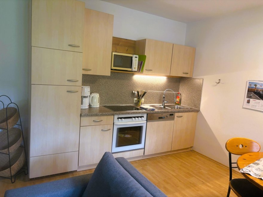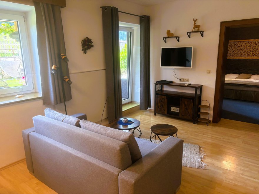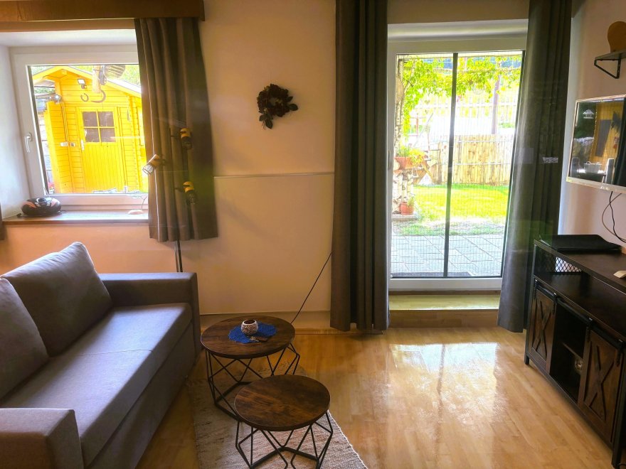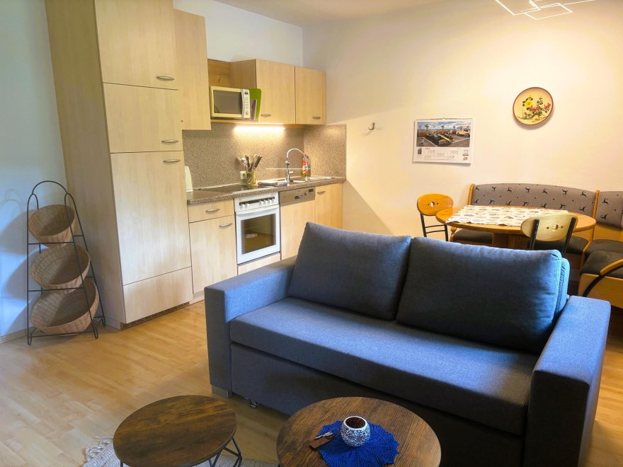 Cosy furnished apartment (southfacing): anteroom, bath/WC, big living room with kitchenette and couch bed for 2 persons, desk, cable-TV, microwave, bedroom with double-bed, balcony on the 2nd floor, terrace on the ground floor, app. 55 m².