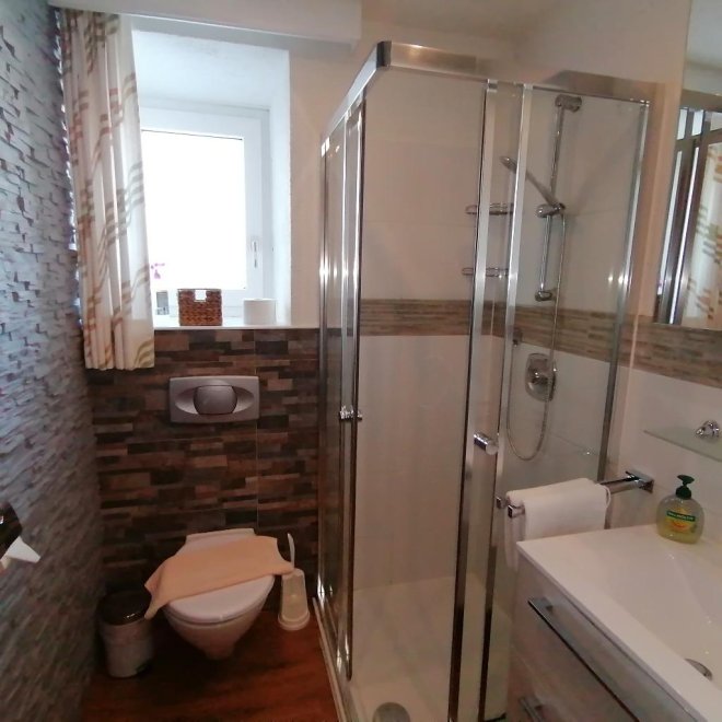 Cosy furnished apartment: anteroom, 2 bedrooms with double-bed, living room with seating facility, kitchenette, shower/toilet , balcony on the 1st and 2nd floor, terrace on the ground floor (southfacing), app. 65 m².