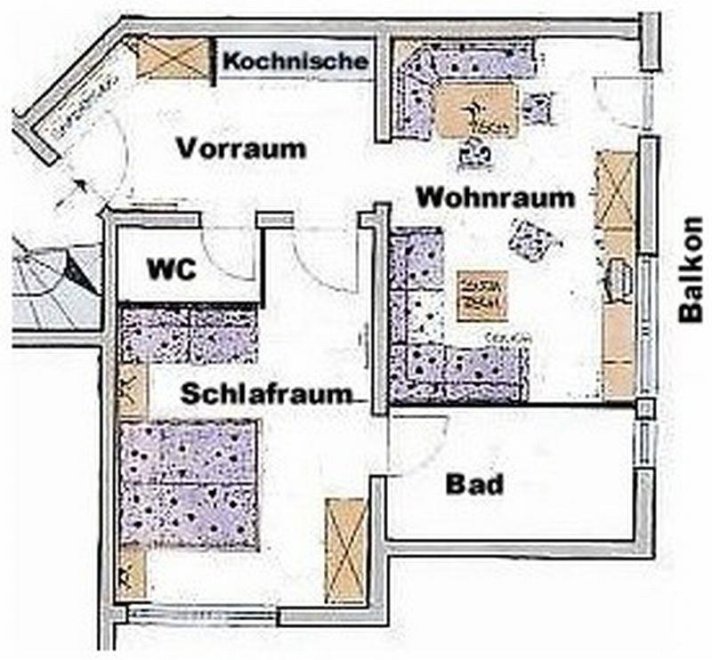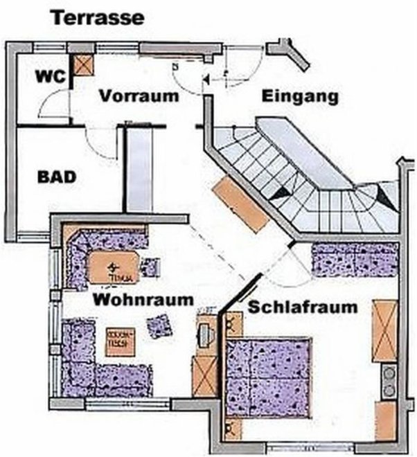 1 sleeping room with double-bed, kitchen with dining table and couch, shower, separate WC, cable-TV, terrace, 38 m².