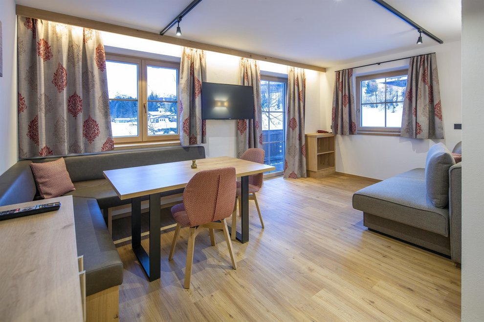 Beautiful apartment in a modern Tyrolean style, 1 bedroom with double bed, 1 living room with sofa bed, seating area, dining area, fully equipped kitchen, shower/toilet, balcony, cable TV, ~27m²
