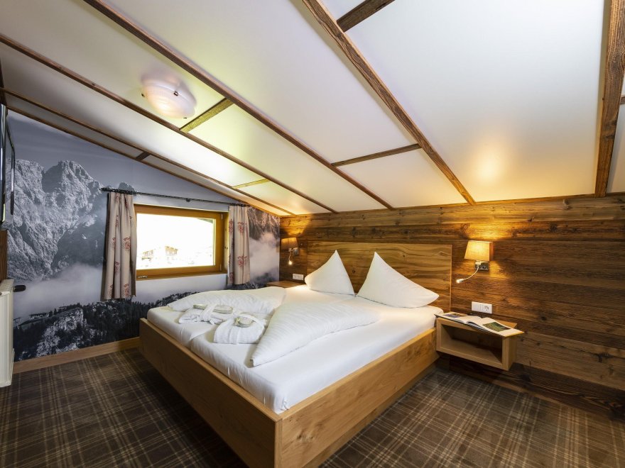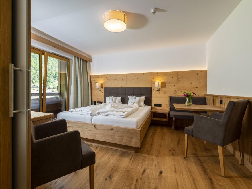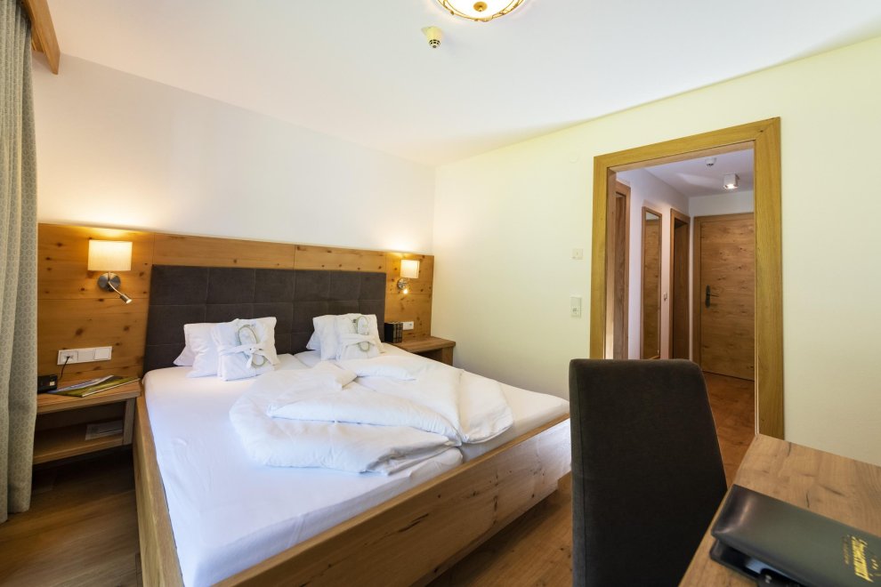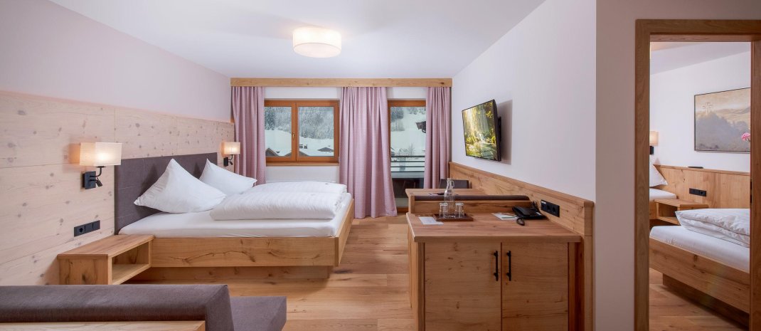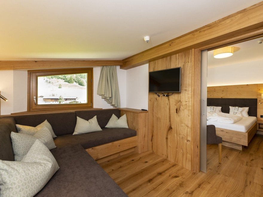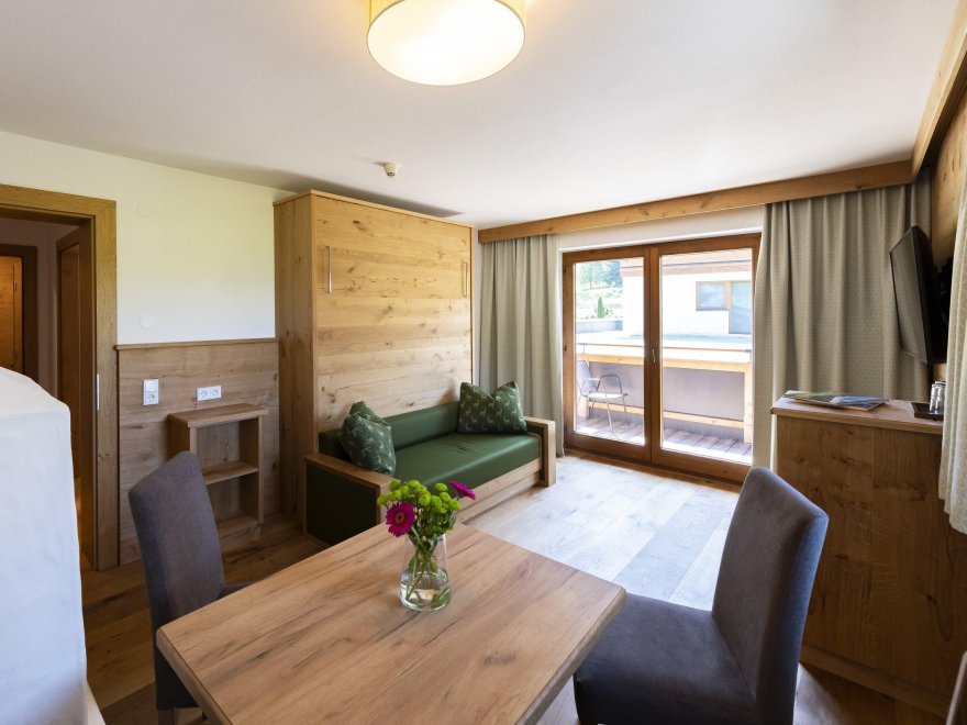 Suite Almrose with 50 m² for 4 or 5 person, balcony, living room with double bed 2,10 m long, couch, table and seperated sleeping room for 2 or 3 person, bath and shower, WC seperated, wooden floor, allergic suitable - no pets allowed, incl. garage, Sat-TV, Wifi, telephone, safe, fridge/mini-bar