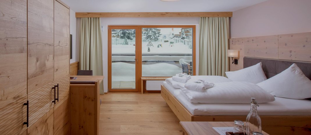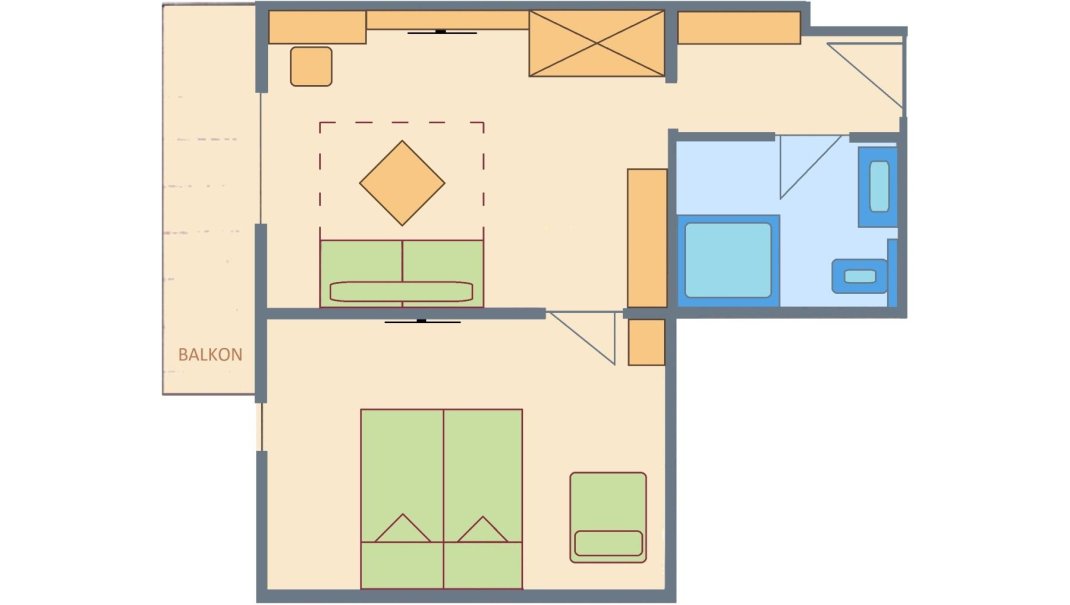 suite 38 m², south side balcony or terrace, double bed 2,10 m long, wooden floor, allergic suitable - no pets allowed, with separate sleeping room for 1 person, shower, WC seperated, incl. garage, Wifi, safe, TV, telephone, fridge/minibar