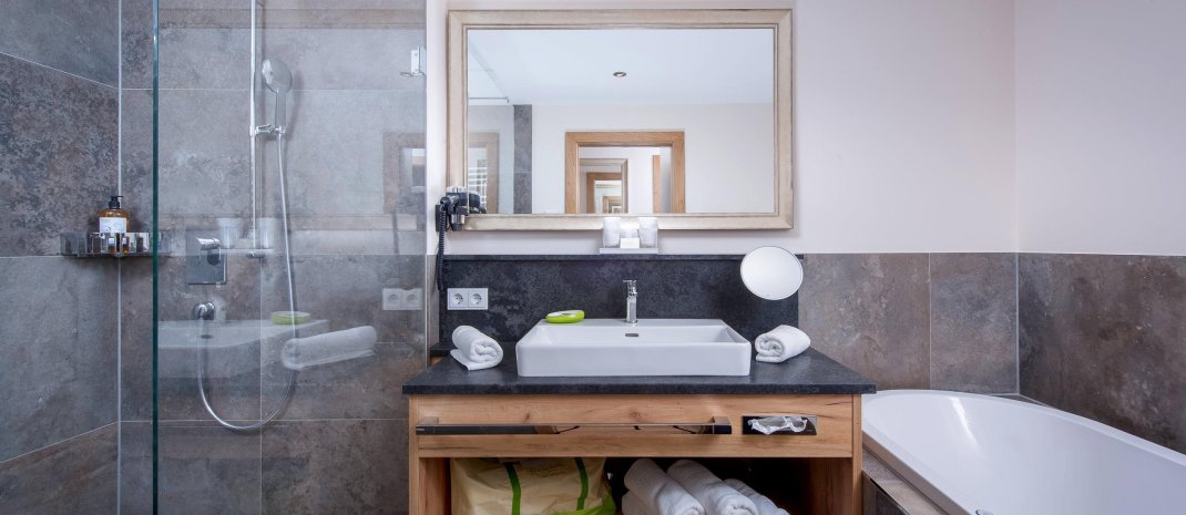 Suite 34 m² for 2-3 person, south side balcony or terrace, wooden floor, allergic suitable - no pets allowed, double bed 2,10 m long, bath with shower, WC seperated, incl. garage, telephone, safe, Sat-TV, fridge/min-bar, Wifi, hair-dryer