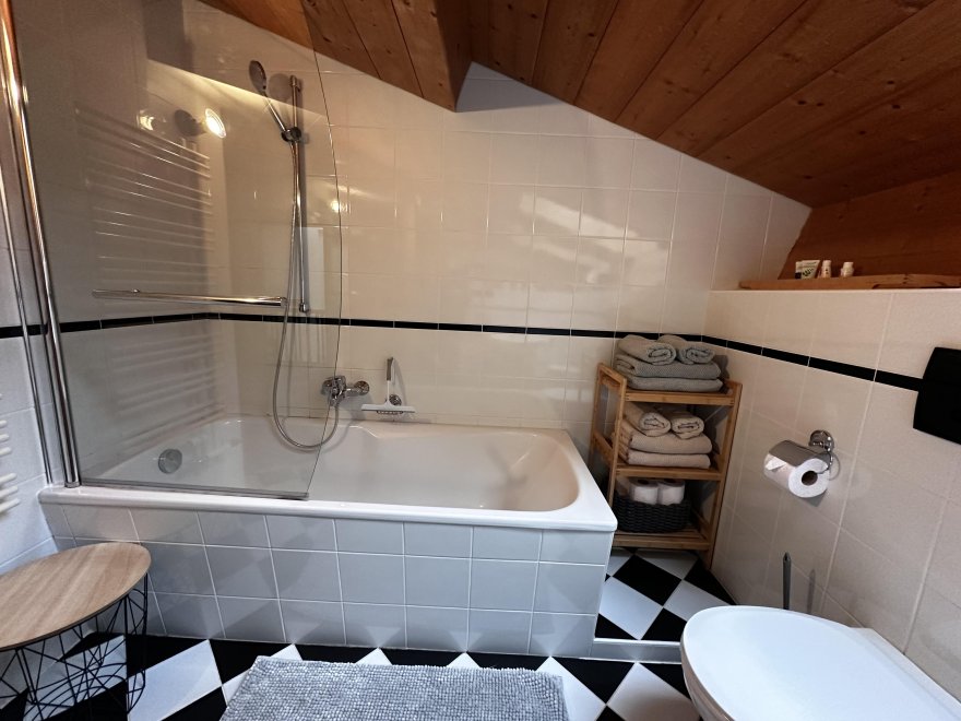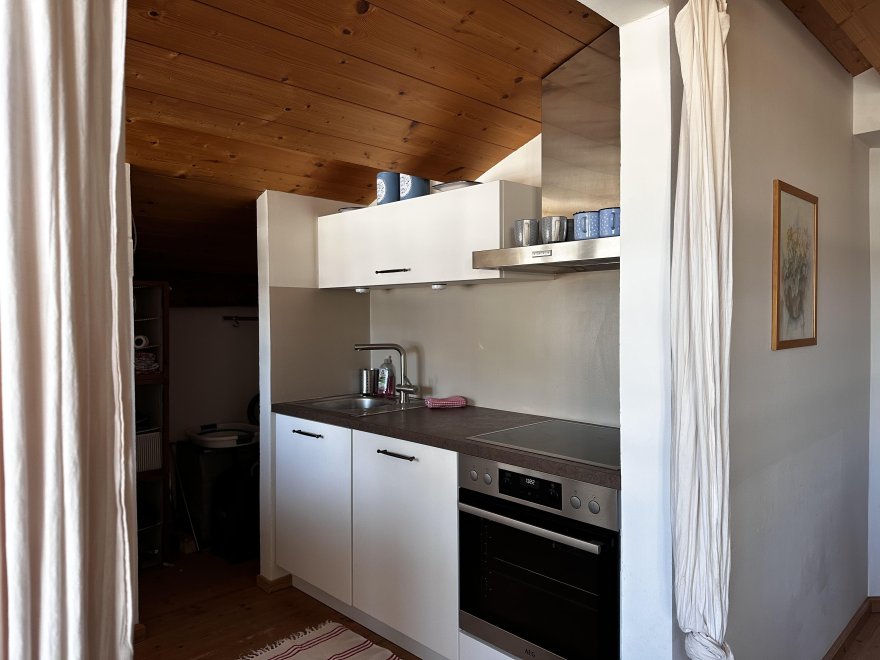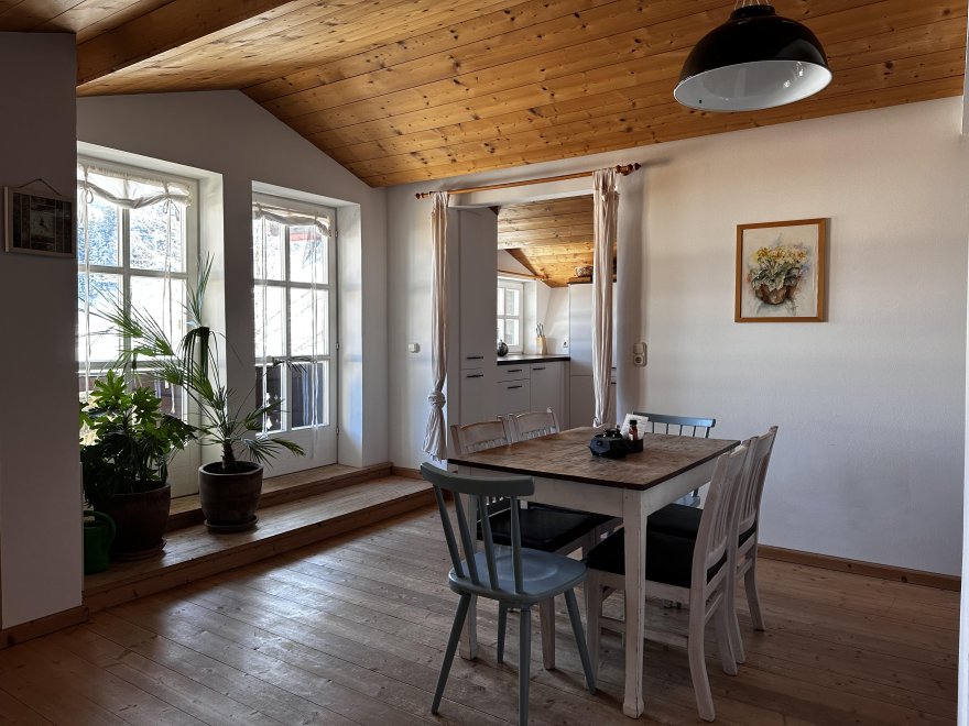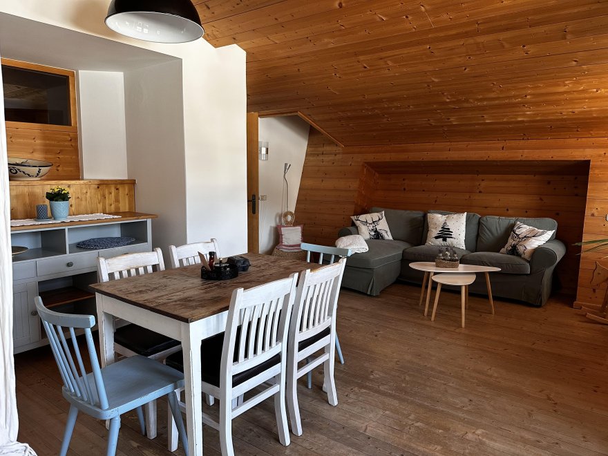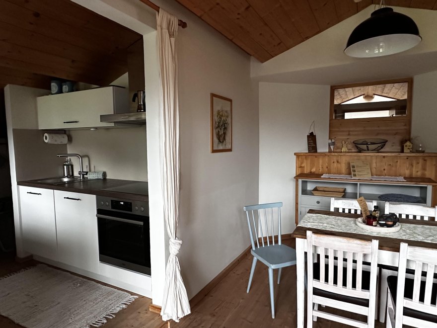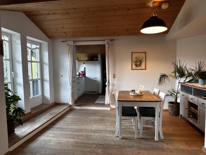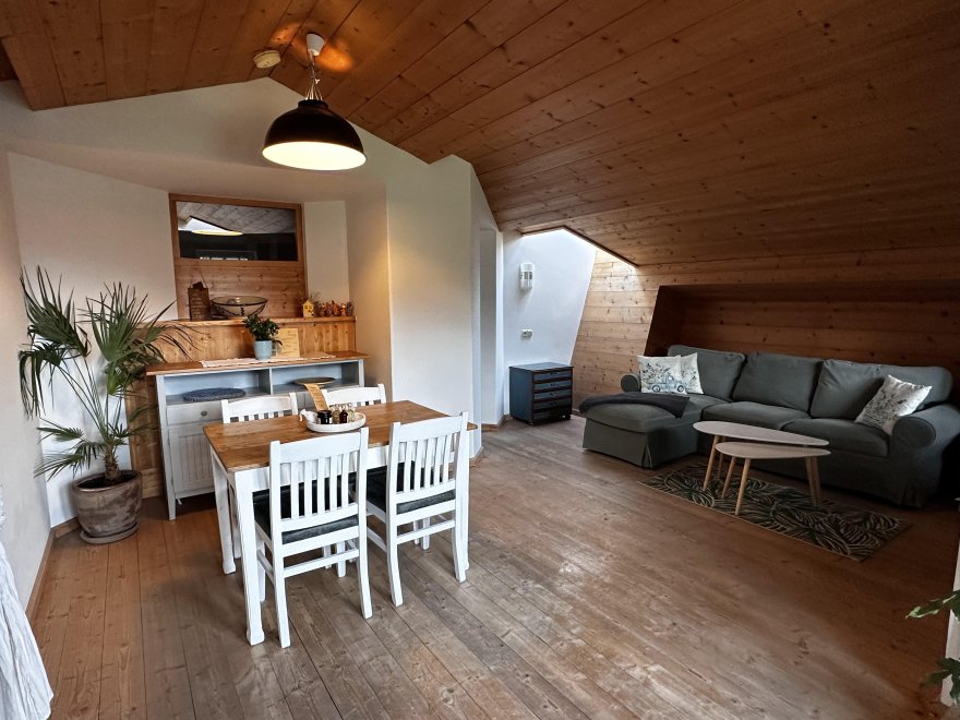 The 75m² flat is located in the attic of the farmhouse. The flat is newly furnished and has a spacious living-dining area with modern kitchen, 2 separate bedrooms and a bathroom with tub/WC, WiFi, cable TV and a balcony.