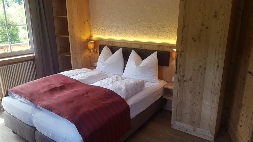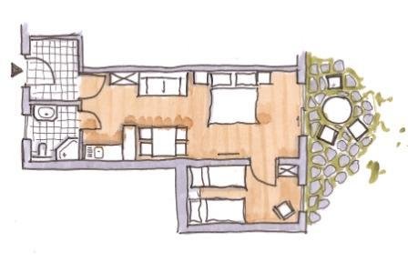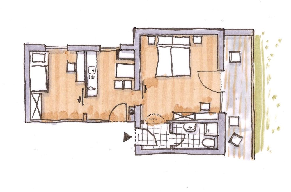 Nice and comfortable rooms with parquet ground, bath, shower, toilet, under-floor heating, double bed, single bed, table, chairs, TV Sat and balcony.