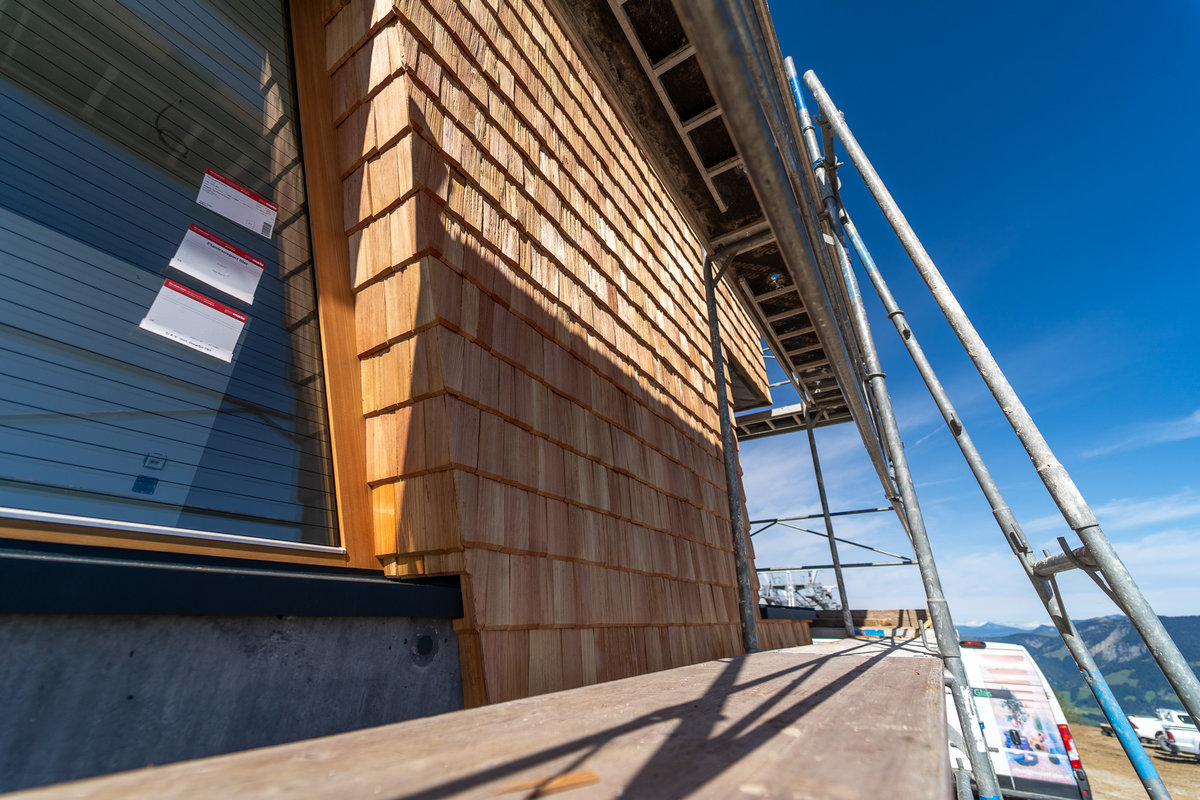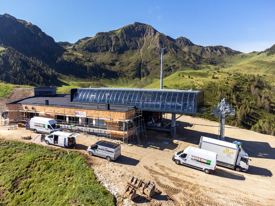 The construction of the new Streuböden cable car is still on schedule in mid-September: most of the cable car technology in the stations has been installed and the external appearance of the cable car is taking shape. For example, the wooden shingles on the façade of the mountain station have already been installed, giving the station a modern and high-quality, but at the same time traditional, restrained and natural design, as can be seen in the pictures.